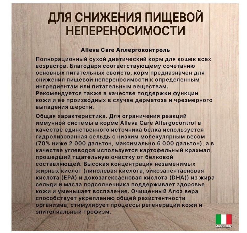 Полнорационный сухой диетический корм для кошек всех возрастов. Благодаря соответствующему сочетанию основных питательных свойств, корм предназначен для снижения пищевой непереносимости к определенным ингредиентам или питательным веществам. Рекомендуется также в качестве поддержки функции кожи и ее производных в случае дерматоза и чрезмерного выпадения шерсти.Общая характеристика. Для ограничения реакций иммунной системы в корме Alleva Care Allergocontrol в качестве единственного источника белка используется гидролизованная сельдь с низким молекулярным весом (70% ниже 2 000 дальтон, максимально 6 000 дальтон), а в качестве углеводов используется картофельный крахмал, прошедший тщательную очистку от белковой составляющей. Высокая концентрация незаменимых жирных кислот (линолевая кислота, эйкозапентаеновая кислота (EPA) и докозагексаеновая кислота (DHA)) из жира сельди и масла подсолнечника поддерживает здоровье кожи и уменьшает воспаление. Очищенный Алоэ вера способствует укреплению общей резистентности организма, стимулирует процессы регенерации кожи и эпителиальный трофизм.Рекомендации по применению. Перед началом и для продления срока использования рекомендуется проконсультироваться с ветеринарным специалистом. Корм готов к употреблению. Рекомендуемая дневная норма кормления указана в таблице и имеет ориентировочный характер. В случае дерматоза и выпадения шерсти использовать изначально до 2 месяцев. В случае непереносимости или аллергии рекомендованный период использования: от 3 до 8 недель. При полном исчезновении симптомов пищевой непереносимости корм Alleva Care Allergocontrol может использоваться как постоянное питание на протяжении одного года. Дневная норма может меняться в зависимости от породы, темперамента, условий содержания и уровня активности. Кошка всегда должна иметь свободный доступ к свежей питьевой воде. Белок животного происхождения: 99%.100% гарантия.