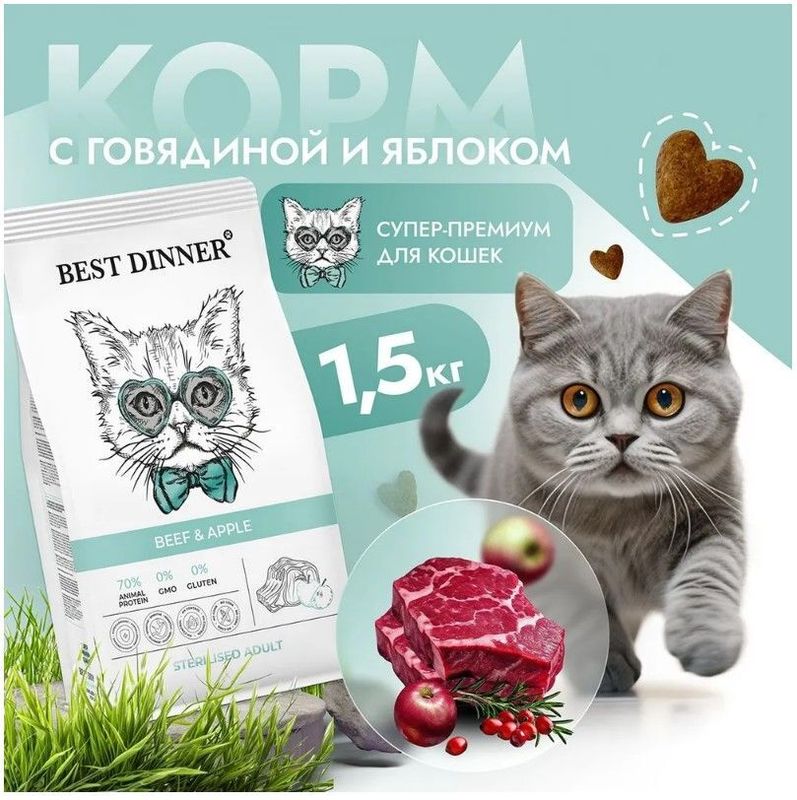 Сухой корм Best Dinner для взрослых кошек, Полнорационный сухой корм для взрослых кошек, .Высококачественный полнорационный корм для кошек Best Dinner , создан с учетом физиологических потребностей кошек . Вкусная говядина богато необходимыми аминокислотами для здоровья питомца и правильного роста котят. Клюква и DL - метионин, добавленные в рецептуру профилактируют мочекаменную болезнь, а юкка Шидигера прекрасно подойдет для вывода шерсти и устранения неприятных запахов из лотка. Гранулы в форме сердечек не оставят равнодушными даже самых привередливых кошек.