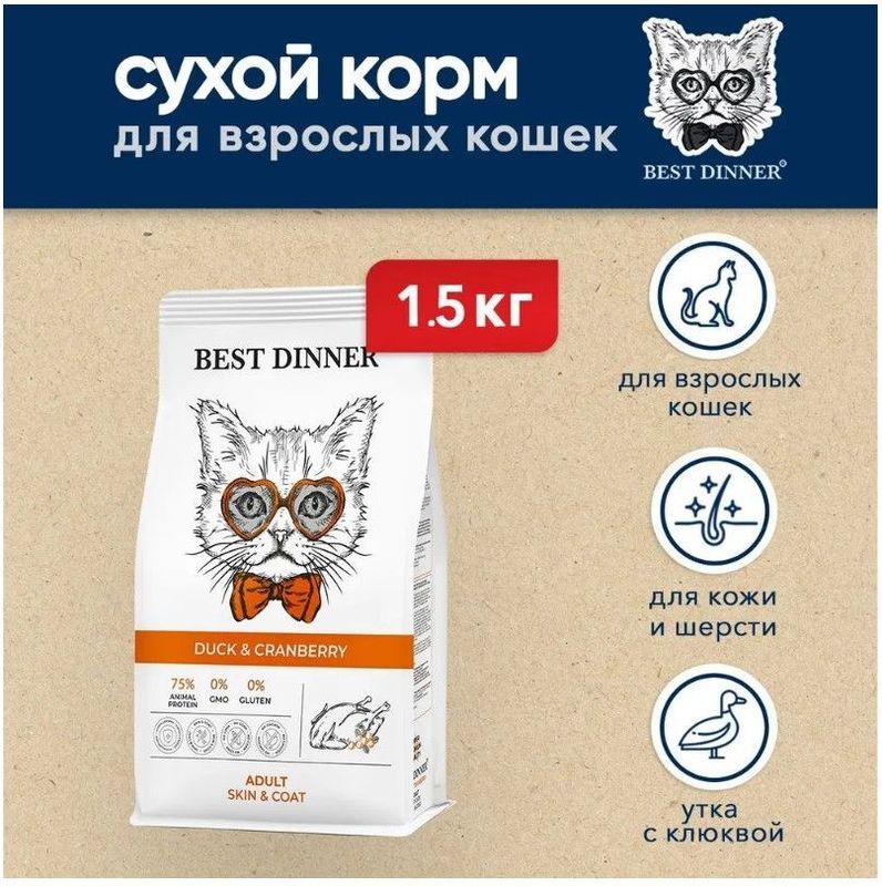 Высококачественный полнорационный корм для кошек Best Dinner с уткой и клюквой, создан с учетом физиологических потребностей кошек. Питательное мясо утки богато всеми необходимыми аминокислотами для здоровья питомца а высокое содержание омега-3 и -6 ненасыщенных жирных кислот, сделают шерстку вашего питомца блестящей и шелковистой. Клюква и DL - метионин, добавленные в рецептуру профилактируют мочекаменную болезнь, а юкка Шидигера прекрасно подойдет для вывода шерсти и устранения неприятных запахов из лотка.Гранулы в форме сердечек не оставят равнодушными даже самых привередливых кошек.