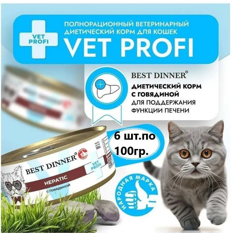 Консервы Best Dinner Vet Profi Hepatic полнорационный, диетический, для кошек и котят, при заболеваниях печени, с говядинойВлажный консервированный полнорационный диетический корм для кошек при заболеваниях печени. Применяется при заболеваниях печени до 4 месяцев в случае временных нарушений и пожизненно в случае хронических заболеваний. Содержит умеренное количество белка и меди. Способствует востановлению и поддержанию функции печени. Рекомендуется проконслуьтироваться с ветеринарным врачом об употреблении или о продлении периода использования данного корма. Вода должна быть в доступна в любое время.
