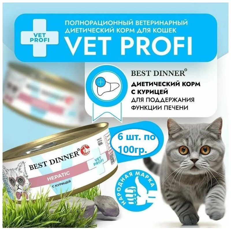 Консервы Best Dinner Vet Profi Hepatic полнорационный, диетический, для кошек и котят, при заболеваниях печени, с курицей Влажный консервированный полнорационный диетический корм для кошек при заболеваниях печени. Применяется при заболеваниях печени до 4 месяцев в случае временных нарушений и пожизненно в случае хронических заболеваний. Содержит умеренное количество белка и меди. Способствует восстановлению и поддержанию функции печени. Рекомендуется проконсультироваться с ветеринарным врачом об употреблении или о продлении периода использования данного корма. Вода должна быть в доступна собаке в любое время