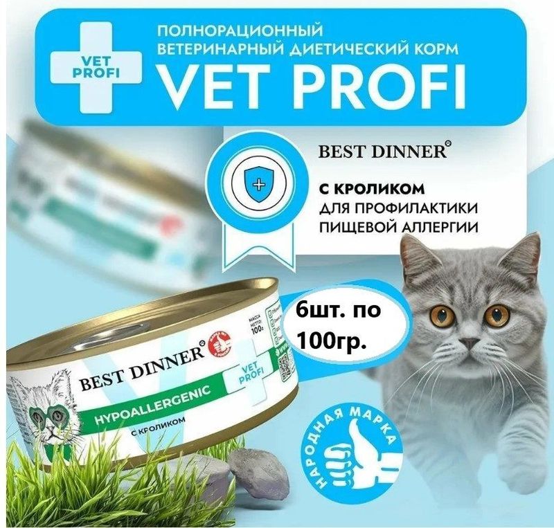 Консервы Best Dinner Vet Profi Hypoallergenic полнорационный, диетический, для кошек и котят, при пищевой аллергии или непереносимости, с кроликом 100грВлажный консервированный полнорационный диетический корм для котят и взрослых кошек при пищевой аллергии или непереносимости. Содержит специально отобранные источники гипоаллергенных белков. Обогащен Омега-3 и 6 жирными кислотами для снижения воспалений. Применяется при пищевой непереносимости и аллергии от 3 до 8 недель. Если признаки аллергии или непереносимости исчезают, допускается пожизненое применение. Способствует востановлению и поддержанию здоровья кожи и шерсти при дерматитах. Рекомендуется проконслуьтироваться с ветеринарным врачом об употреблении или о продлении периода использования данного корма. Вода должна быть в доступна собаке в любое время.
