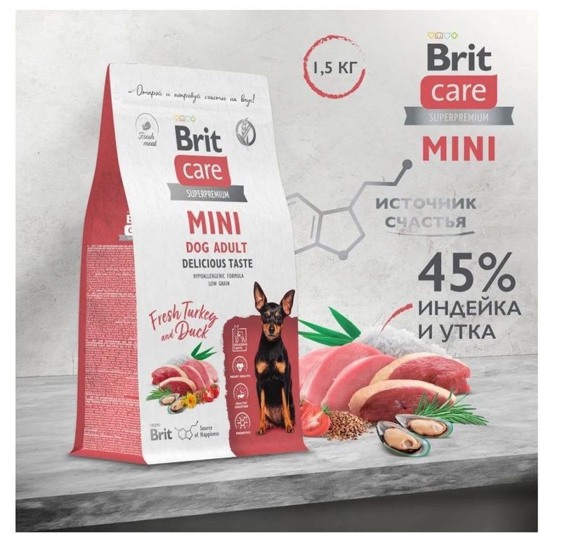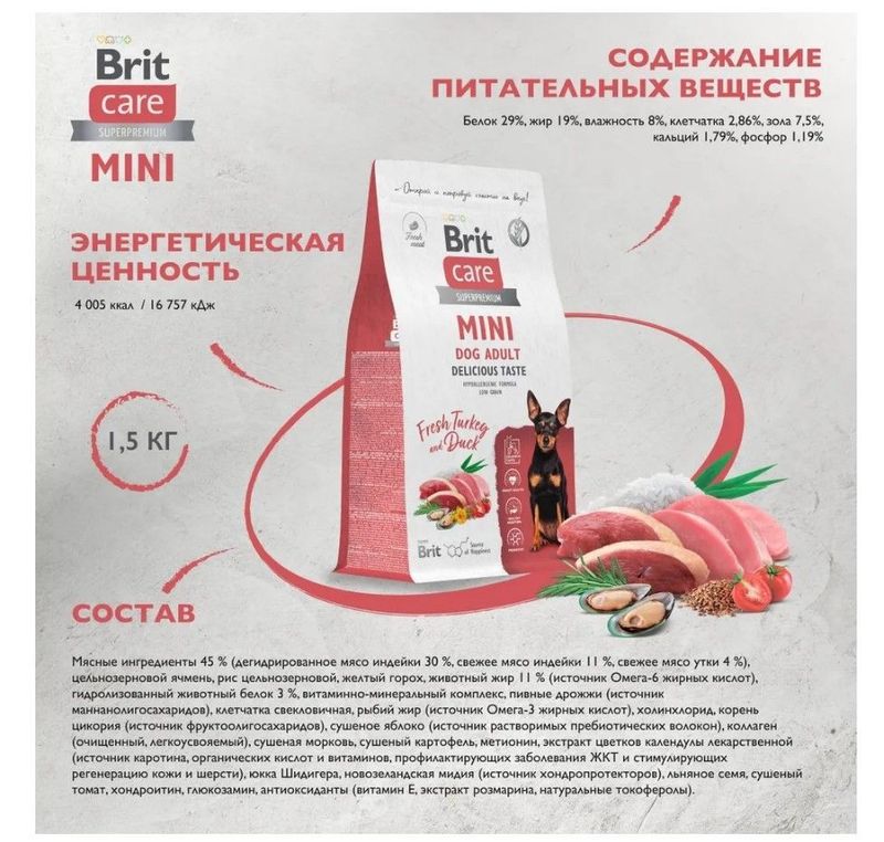 Brit Care Mini Superpremium Dog Adult Delicious Taste - это высококачественный сухой корм суперпремиум-класса, специально разработанный для взрослых собак мини-пород весом до 10 кг. С уникальным составом, включающим свежую индейку и утку, корм обеспечивает вашего питомца всеми необходимыми питательными веществами. Он идеально подходит для привередливых собак, благодаря своему вкусному и аппетитному составу. Особенности: • Содержит свежую индейку и утку как источники качественного белка. • Идеальный выбор для привередливых собак мини-пород благодаря вкусному составу. • Обогащен витаминами, минералами и антиоксидантами для поддержания общего здоровья и иммунной системы питомца. • Предоставляет полноценное и сбалансированное питание для здоровья и активности вашей собаки. Условия хранения: • Хранить при температуре от 0 до 25 С и относительной влажности воздуха не более 75%. • Беречь от солнечных лучей.