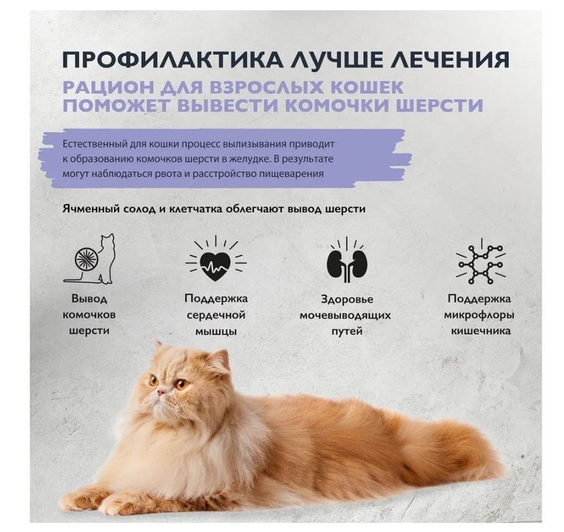 Полнорационный сухой корм суперпремиум-класса с белой рыбой и индейкой для взрослых кошек. Вывод шерсти. Вывод комочков шерсти Здоровье мочевыводящих путей Поддержка сердечной мышцы Поддержка микрофлоры кишечника Естественный для кошки процесс вылизывания приводит к образованию комочков шерсти в желудке. В результате могут наблюдаться рвота и расстройство пищеварения. Индейка естественный источник L-триптофана, гормона счастья Повышенное содержание клетчатки и ячменный солод для выведения комочков шерсти естественным путём Жирные кислоты из натуральных источников для красоты шерсти и здоровья кожи Свежее мясо для активности в течение дня Витамины, минералы и антиоксиданты для поддержки иммунитета питомца Растворимые и нерастворимые пищевые волокна для здорового пищеварения и микрофлоры кишечника Состав: рыба и мясо 50,4 % (дегидрированное мясо индейки 30 %, свежее мясо и субпродукты индейки 12 %, дегидрированная рыба 4,2 %, свежая белая рыба 4,2 %), рис цельнозерновой, ячмень, желтый горох, животный жир 7 % (источник Омега-6 жирных кислот), клетчатка свекловичная, гидролизованный животный белок 3,5 %, витаминно-минеральный комплекс, пивные дрожжи (источник маннанолигосахаридов), холинхлорид, сушеный картофель, DL-метионин, таурин, сушеная морковь, сушеное яблоко (источник растворимых пребиотических волокон), ячменный солод, юкка Шидигера, новозеландская мидия, одуванчик, льняное семя, клюква, хондроитин, глюкозамин, антиоксидант (в том числе экстракт розмарина, натуральные токоферолы). Содержание питательных веществ на 1 кг: белок 32 %, жир 14,8 %, влажность 8 %, клетчатка 4 %, зола 8,5 %, кальций 1,7 %, фосфор 1,4 %. Аналитический состав: белки 32 гр. жиры 14,8 гр. зола 8,5 гр. клетчатка 4 гр. влажность 8 гр. кальций 1,7 гр. фосфор 1,4 гр. Энергетическая ценность на кг: 3740 ккал / 15649 кДж. Срок годности: 18 мес. с даты изготовления. Товар упакован в пакеты из полимерных материалов, соответствующим техническим регламентам. Условия хранения: хранить при температуре от 0 до 25 С и относительной влажности воздуха не более 75%. Беречь от солнечных лучей. Рекомендации по кормлению: Следуйте рекомендациям по ежедневному питанию, представленным в таблице кормления. Корм следует давать сухим или увлажненным теплой водой. Суточная норма может варьироваться в зависимости от индивидуальных потребностей животного и таких факторов, как возраст и уровень активности. У питомца всегда должен быть доступ к свежей питьевой воде. При вводе нового корма смешайте его небольшое количество с привычной едой и в течение нескольких дней постепенно увеличивайте количество нового корма.
