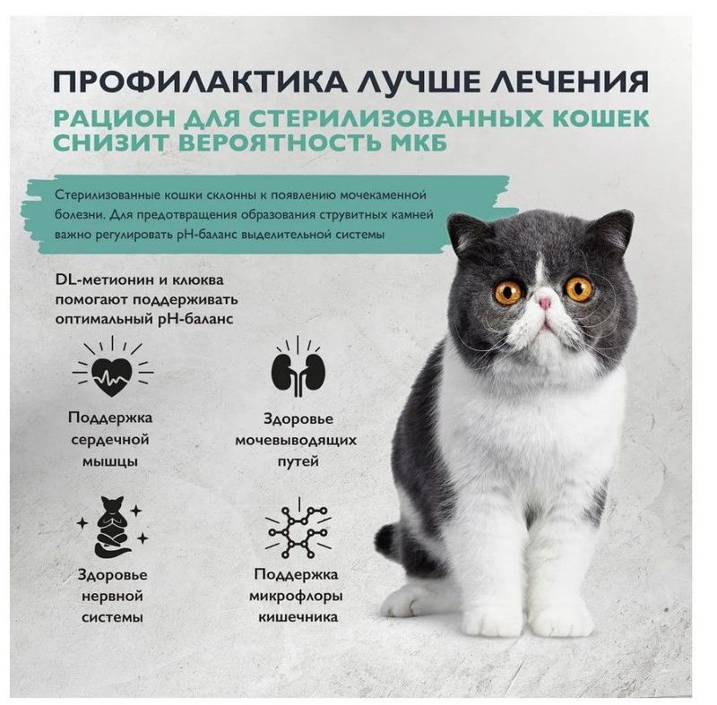 Полнорационный сухой корм суперпремиум-класса с индейкой и уткой для стерилизованных кошек. Профилактика МКБ. Здоровье мочевыводящих путей Поддержка сердечной мышцы Здоровье нервной системы Поддержка микрофлоры кишечника Стерилизованные кошки склонны к появлению мочекаменной болезни. Для предотвращения образования струвитных камней важно регулировать pH-баланс выделительной системы. Индейка естественный источник L-триптофана, гормона счастья DL-метионин поддерживает здоровье мочевыдели тельной системы Жирные кислоты из натуральных источников для красоты шерсти и здоровья кожи Свежее мясо для активности в течение дня Витамины, минералы и антиоксиданты для поддержки иммунитета питомца Растворимые и нерастворимые пищевые волокна для здорового пищеварения и микрофлоры кишечника Состав: мясо птицы 48 % (дегидрированное мясо индейки 32 %, свежее мясо и субпродукты индейки 12 %, свежее мясо утки 4 %), рис цельнозерновой, ячмень, желтый горох, клетчатка свекловичная, животный жир 4 %, гидролизованный животный белок 3,5 %, витаминно-минеральный комплекс, пивные дрожжи, таурин, холинхлорид, L-карнитин, сушеный картофель, DL-метионин, сушеное яблоко, корень цикория, сушеная морковь, хлорид натрия, юкка Шидигера, новозеландская мидия, розмарин, календула, льняное семя, клюква, хондроитин, глюкозамин, антиоксидант (в том числе экстракт розмарина, натуральные токоферолы). Содержание питательных веществ на 1 кг: белок 31 %, жир 12 %, клетчатка 3,9 %, влажность 8 %, зола 8,5 %, кальций 1,6 %, фосфор 1,1 %. Аналитический состав: белки 31 гр. жиры 12 гр. зола 8,5 гр. клетчатка 3,9 гр. влажность 8 гр. кальций 1,6 гр. фосфор 1,1 гр. Энергетическая ценность на кг: 3620 ккал / 15147 кДж. Срок годности: 18 мес. с даты изготовления. Товар упакован в пакеты из полимерных материалов, соответствующим техническим регламентам. Условия хранения: хранить при температуре от 0 до 25 С и относительной влажности воздуха не более 75%. Беречь от солнечных лучей. Рекомендации по кормлению: Следуйте рекомендациям по ежедневному питанию, представленным в таблице кормления. Корм следует давать сухим или увлажненным теплой водой. Суточная норма может варьироваться в зависимости от индивидуальных потребностей животного и таких факторов, как возраст и уровень активности. У питомца всегда должен быть доступ к свежей питьевой воде. При вводе нового корма смешайте его небольшое количество с привычной едой и в течение нескольких дней постепенно увеличивайте количество нового корма.