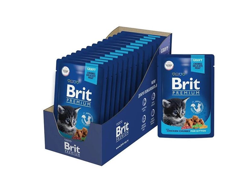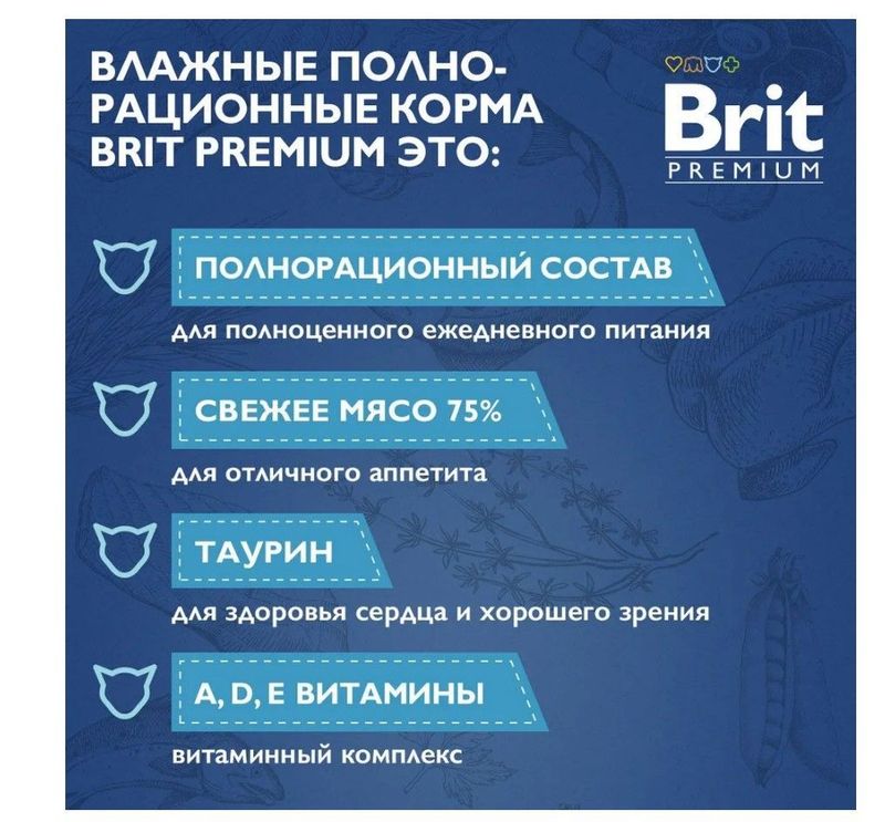 Мясо и мясные субпродукты 75 % (в том числе мясо цыплят 10 %), мука рисовая, мука пшеничная, рыбий жир, минерально-витаминный комплекс, загуститель.