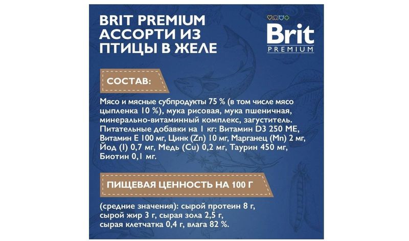 Мясо и мясные субпродукты 75 % (в том числе мясо цыпленка 10 %), мука рисовая, мука пшеничная, минерально-витаминный комплекс, загуститель. ПИЩЕВАЯ ЦЕННОСТЬ НА 100 Г (СРЕДНИЕ ЗНАЧЕНИЯ): сырой протеин 8 г, сырой жир 3 г, сырая зола 2,5 г, сырая клетчатка 0,4 г, влага 82 %.