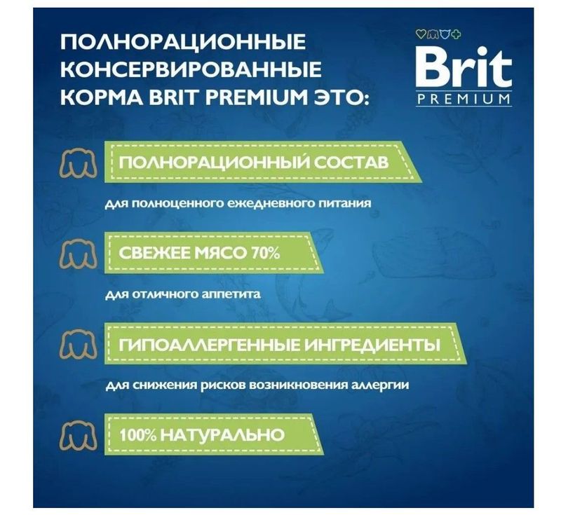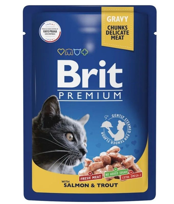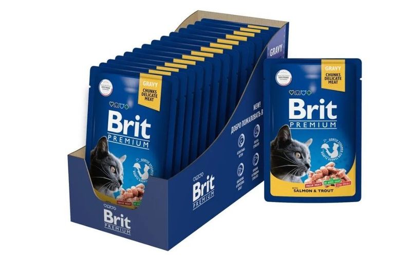 Мясо и мясные субпродукты 60 %, форель и рыбные субпродукты 15 %, мука рисовая, мука пшеничная, минерально-витаминный комплекс, загуститель. Питательные добавки на 1 кг: витамин D3 250 МЕ, витамин Е 100 мг, цинк 10 мг, марганец 2 мг, йод 0,7 мг, медь 0,2 мг, таурин 450 мг, биотин 0,1 мг.