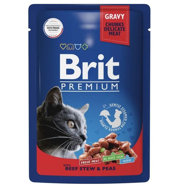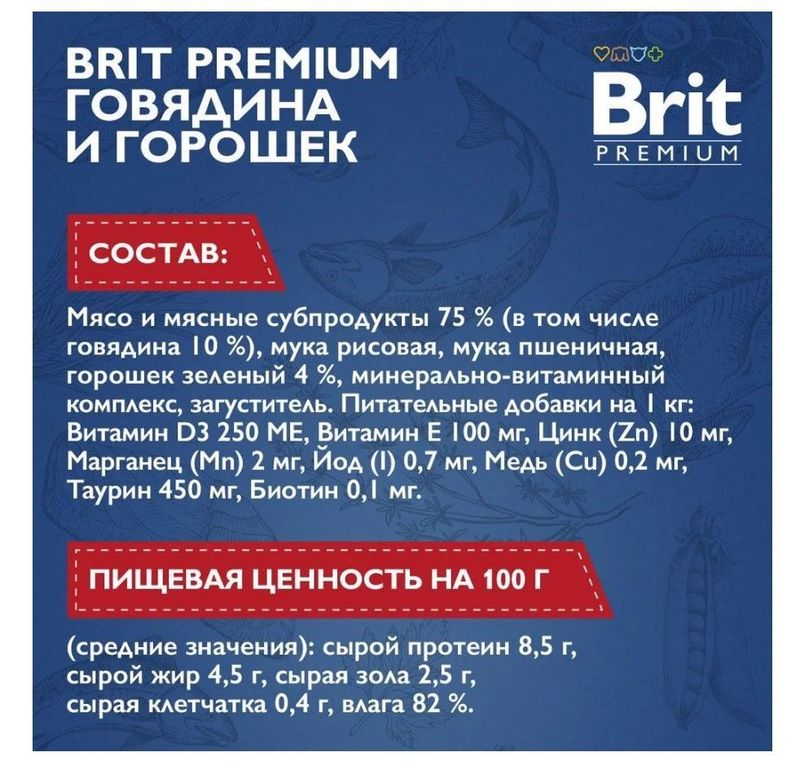 мясо и мясные субпродукты 75 % (в том числе говядина 10 %), мука рисовая, мука пшеничная, горошек зеленый 4 %, минерально-витаминный комплекс, загуститель.