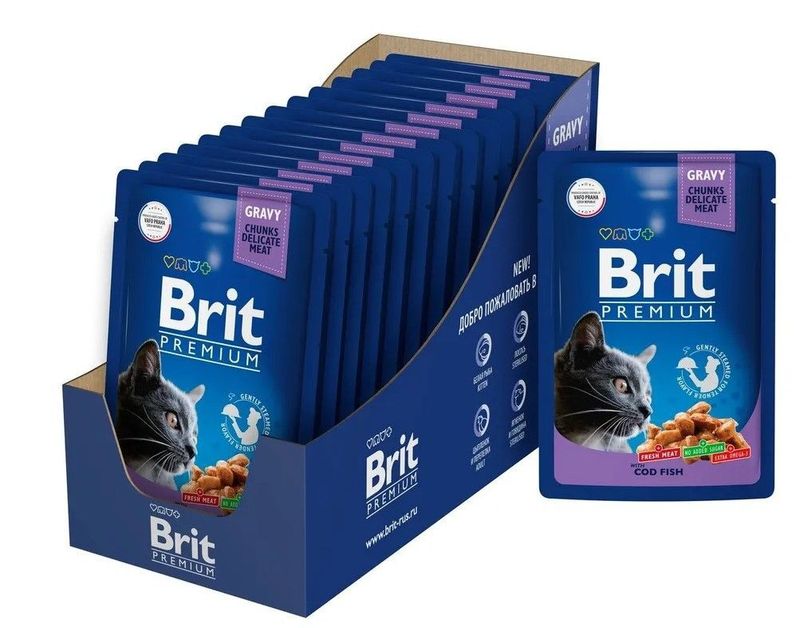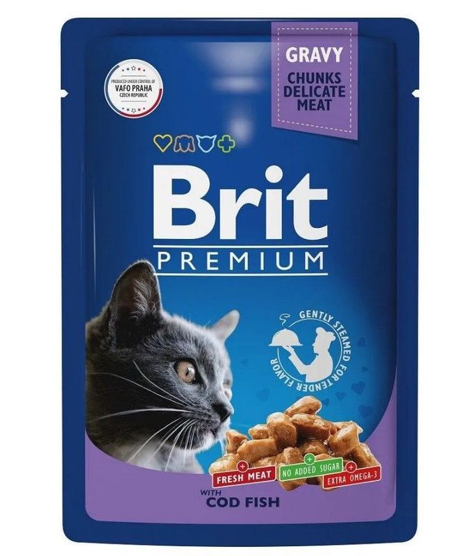 мясо и мясные субпродукты 60 %, рыба и рыбные субпродукты 15 % (в том числе треска 5%), мука пшеничная, мука рисовая, минерально-витаминный комплекс, загуститель.