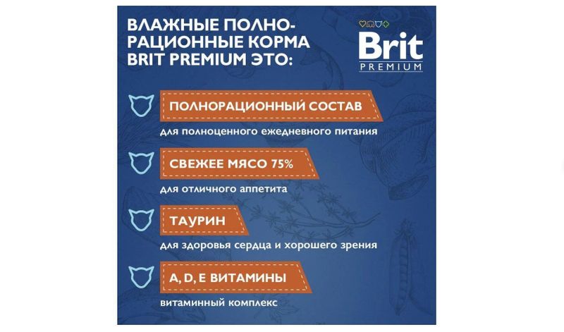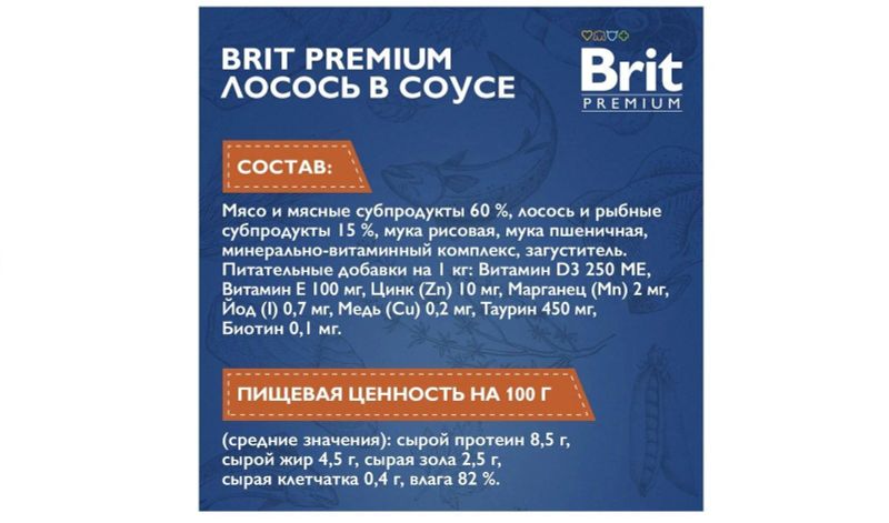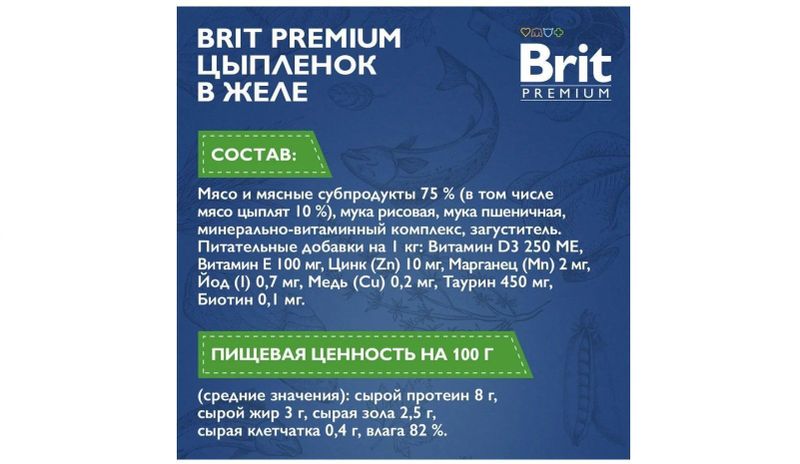 Мясо и мясные субпродукты 75 % (в том числе мясо цыплят 10 %), мука рисовая, мука пшеничная, минерально-витаминный комплекс, загуститель. ПИЩЕВАЯ ЦЕННОСТЬ НА 100 Г (СРЕДНИЕ ЗНАЧЕНИЯ): сырой протеин 8 г, сырой жир 3 г, сырая зола 2,5 г, сырая клетчатка 0,4 г, влага 82 %. ПИТАТЕЛЬНЫЕ ДОБАВКИ НА 1 КГ: витамин D3 250 МЕ, витамин Е 100 мг, цинк 10 мг, марганец 2 мг, йод 0,7 мг, медь 0,2 мг, таурин 450 мг, биотин 0,1 мг.