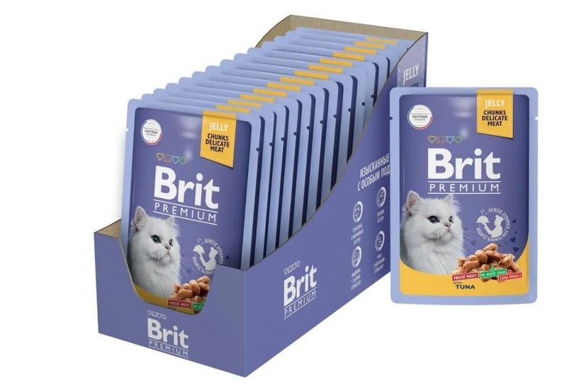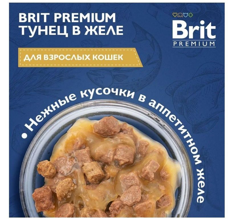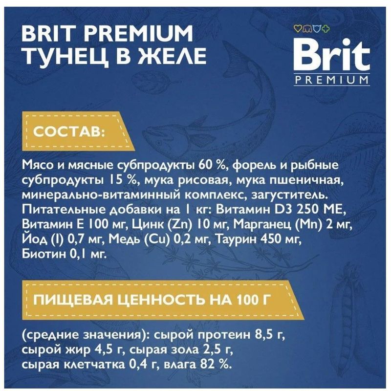 Тунец: мясо и мясные субпродукты 60 %, тунец и рыбные субпродукты 15 %, мука рисовая, мука пшеничная, минерально-витаминный комплекс, загуститель.Пищевая ценность на 100 г (средние значения): сырой протеин 8,5 г, сырой жир 4,5 г, сырая зола 2,5 г, сырая клетчатка 0,4 г, влага 82 %. Питательные добавки на 1 кг: витамин D3 250 МЕ, витамин Е 100 мг, цинк 10 мг, марганец 2 мг, йод 0,7 мг, медь 0,2 мг, таурин 450 мг, биотин 0,1 мг.Энергетическая ценность на 100 г: 81,3 ккал / 340 кДж.