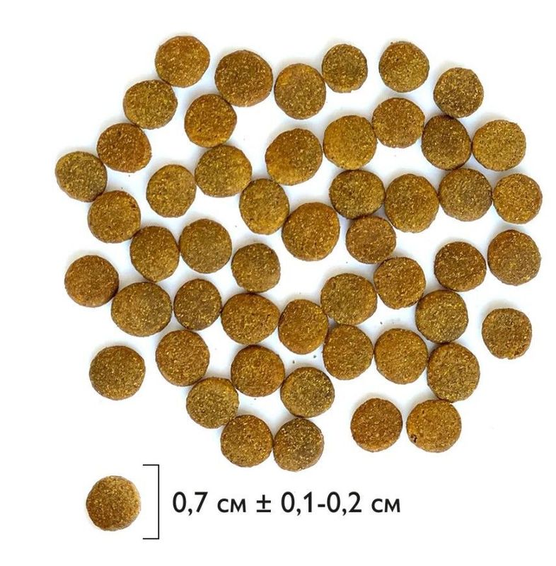 дегидрированное мясо курицы 35 %, рис, маисовый протеин, маис цельнозерновой, свекольная пульпа, жир куриный (источник Омега-6 жирных кислот), гидролизованная и дегидратированная печень 3,5%, дрожжи (источник маннанолигосахаридов), витаминно-минеральный комплекс, рыбий жир (источник Омега-3 жирных кислот), таурин, топинамбур (источник фруктоолигосахаридов), , клюква, DL-Метионин, антиокислитель, экстракт юкки Шидигера, экстракт розмарина.