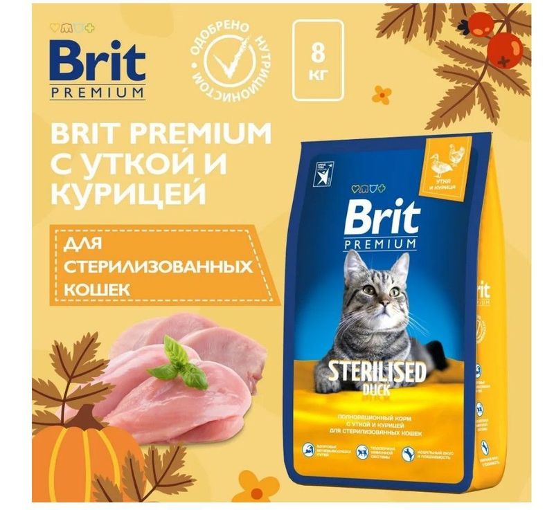 Brit Premium Cat Sterilized (Утка, курица)- предназначен для взрослых стерилизованных кошек. Сбалансированный состав содержит все витамины и минералы, необходимые для ежедневного здорового питания вашего питомца. Корм поможет сохранить здоровье и активность вашего питомца, а мясо в составе обеспечивает притягательный аромат и вкус, который не оставит равнодушным даже самых привередливых питомцев.