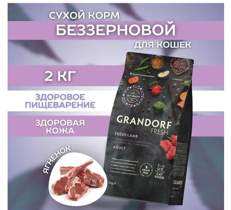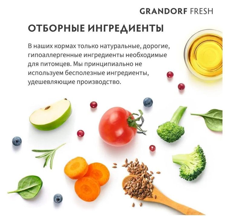 Благодаря беззерновому и безглютеновому составу корма Grandorf FRESH легко усваиваются и отлично подходят для животных с чувствительным пищеварением или пищевой аллергией.
