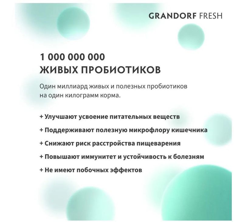 Каждый рацион Grandorf Fresh содержит один миллиард живых и полезных пробиотиков на один килограмм корма. Пробиотики поддерживают микрофлору кишечника, помогают усвоению питательных веществ и укрепляют иммунитет. Пробиотики добавляются после производства в специальных кишечнорастворимых микрокапсулах, остаются живыми и выполняют свои функции.