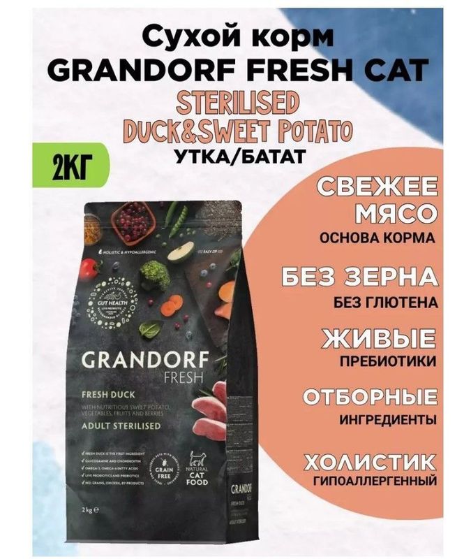Беззерновой корм с живыми пробиотиками. Для взрослых стерилизованных кошек, кастрированных котов от 1 года и пожилых кошек с чувствительным пищеварением или склонных к аллергии. Свежее гипоаллергенное мясо утки благотворно влияет на здоровье кошки. Благодаря гипоаллергенным ингредиентам, беззерновому составу, живым пробиотикам, отсутствию глютена, корм имеет отличную усвояемость, высокую пищевую ценность и помогает оставаться вашему питомцу здоровым и жизнерадостным на протяжении долгих лет жизни.