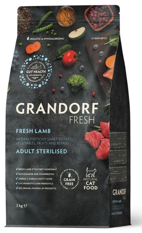 Беззерновой корм с живыми пробиотиками. Для взрослых стерилизованных кошек, кастрированных котов от 1 года и пожилых кошек с чувствительным пищеварением или склонных к аллергии. Свежее гипоаллергенное и питательное мясо ягненка благотворно влияет на здоровье кошки. Благодаря гипоаллергенным ингредиентам, беззерновому составу, живым пробиотикам, отсутствию глютена, корм имеет отличную усвояемость, высокую пищевую ценность и помогает оставаться вашему питомцу здоровым и жизнерадостным на протяжении долгих лет жизни.