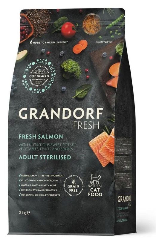 Беззерновой корм с живыми пробиотиками. Для взрослых стерилизованных кошек, кастрированных котов от 1 года и пожилых кошек для здоровья кожи и шерсти или склонных к аллергии. Свежее гипоаллергенное и питательное филе лосося благотворно влияет на пищеварительную систему кошки. Благодаря правильно подобранным ингредиентам, а также сбалансированному содержанию омега-3 и 6 жирных кислот корм имеет отличную усвояемость, высокую пищевую ценность и поддерживает здоровье чувствительной кожи и шерсти кошки.