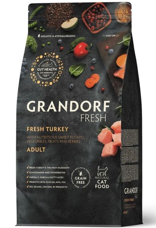 Беззерновой корм с живыми пробиотиками. Для взрослых стерилизованных кошек, кастрированных котов от 1 года и пожилых кошек с чувствительным пищеварением или склонных к аллергии. Свежее гипоаллергенное и питательное мясо индейки благотворно влияет на пищеварительную систему кошки. Благодаря монопротеиновой формуле, гипоаллергенным ингредиентам, беззерновому составу, живым пробиотикам, отсутствию глютена, корм имеет отличную усвояемость, высокую пищевую ценность и помогает оставаться вашему питомцу здоровым и жизнерадостным на протяжении долгих лет жизни. Используется мясо высшего сорта, без костей и субпродуктов. Это гарантирует, что ваш питомец получает высокопитательный, легко усвояемый источник белка.