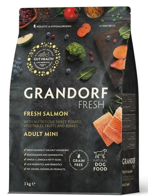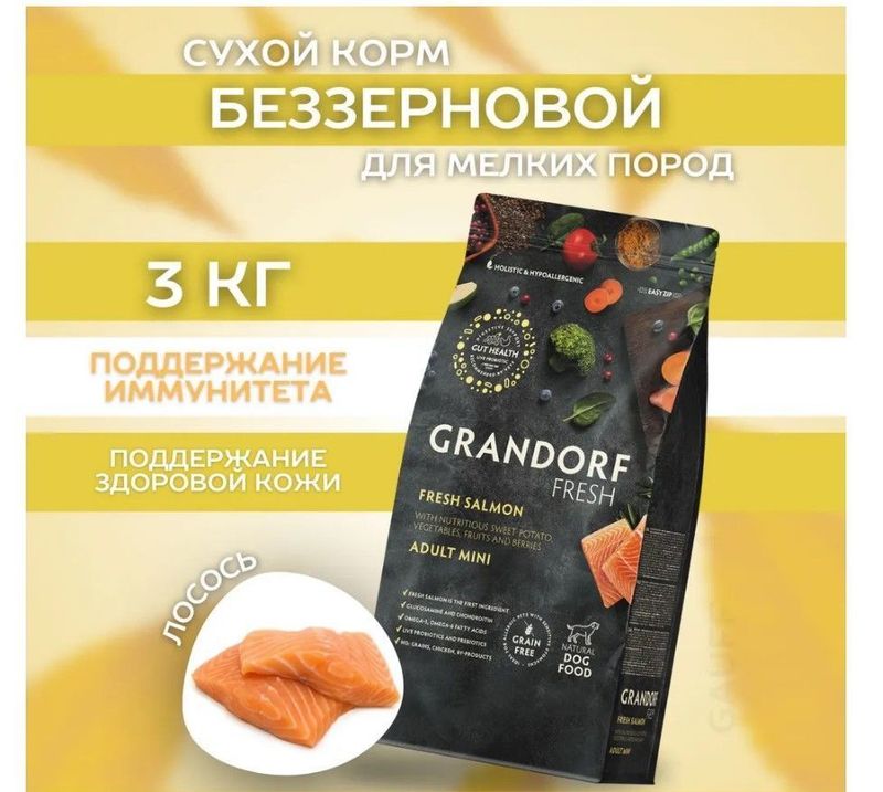 Беззерновой корм с живыми пробиотиками. Для взрослых собак мелких пород, для здоровья кожи и шерсти или склонных к аллергии. Свежее гипоаллергенное и питательное филе лосося благотворно влияет на пищеварительную систему собаки. Благодаря правильно подобранным ингредиентам, а также сбалансированному содержанию омега-3 и 6 жирных кислот корм имеет отличную усвояемость, высокую пищевую ценность и поддерживает здоровье чувствительной кожи и шерсти собаки. Свежее филе лосося – основной источник животного белка. Мясо богато незаменимыми аминокислотами и поразит даже самого искушенного питомца своим незабываемым вкусом и ароматом. Батат – основной источника углеводов и клетчатки. Легко усваиваемый, богат множеством витамин и является отличной альтернативой зерновым кормам при пищевой непереносимости и аллергии.