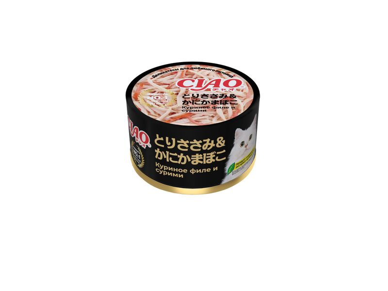 Супер-премиальный влажный корм для кошек CIAO can (ЧАО КЭН) от японского производителя Inaba приготовлен на основе кусочков филе фермерской курицы с добавлением сурими со вкусом краба. Внутри упаковки ароматные нежные волокна в желе, которые подойдут даже самым привередливым кошкам и кошкам с чувствительным пищеварением.