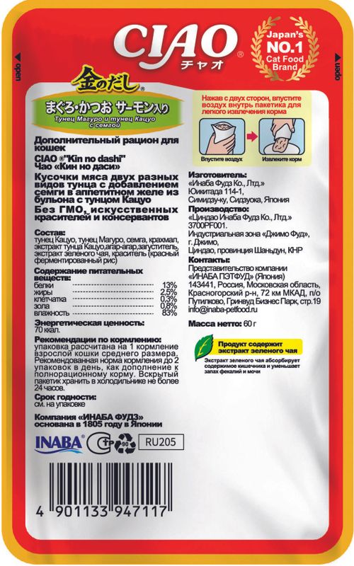 INABA CIAO Корм влажный для кошек Kinnodashi Тунец Магуро и тунец Кацуо с сёмгой, пауч 60г*12шт(720гр.)
