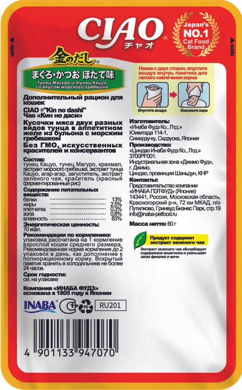 INABA CIAO Корм влажный для кошек Kinnodashi Тунец Магуро и тунец Кацуо со вкус морского гребешка пауч 60г*12шт(720гр.)