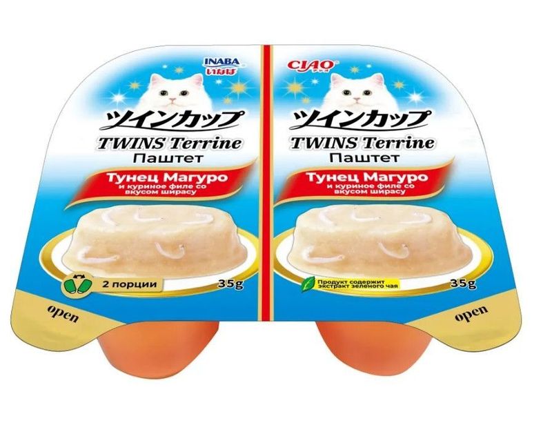 Суперпремиальный паштет для кошек CIAO TWINS Terrine (ЧАО ТВИНС ТЕРРИН) от японского производителя Inaba приготовлен на основе мяса глубоководного тунца Магуро и нежных кусочков филе фермерской курицы с добавлением кацуобуси. Корма и лакомства Inaba отличаются высоким качеством и неповторимым вкусом, ведь они изготавливаются на основе отборных традиционных японских ингредиентов! Во все продукты добавлен экстракт зеленого чая, который, благодаря содержанию катехина, нейтрализует неприятные запахи содержимого кишечника. Состав обогащён витамином Е - натуральным антиоксидантом, поддерживающим иммунную систему, не содержит искусственных добавок, красителей и консервантов.
