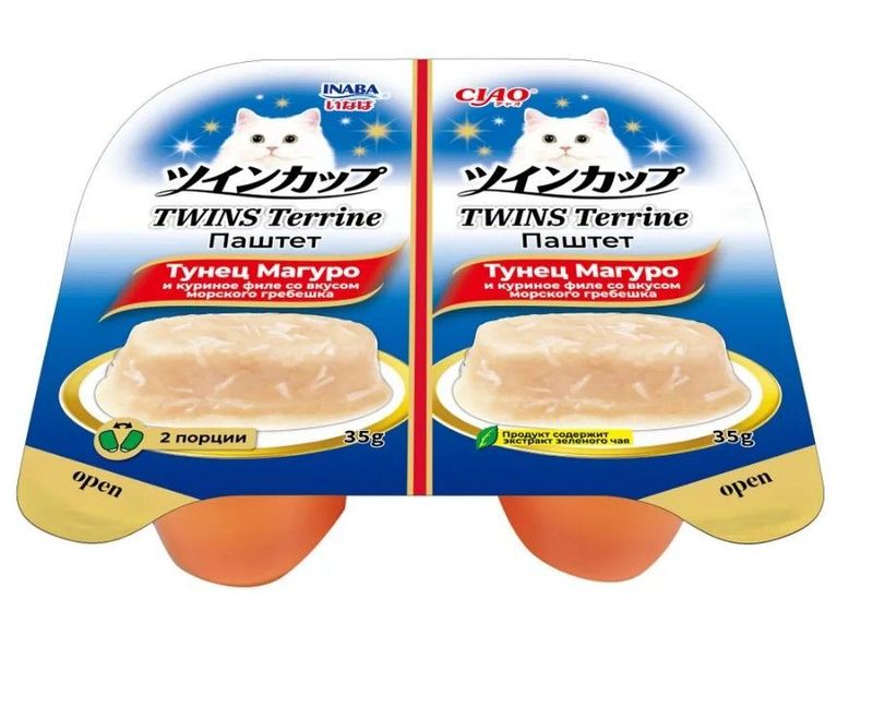 Суперпремиальный паштет для кошек CIAO TWINS Terrine (ЧАО ТВИНС ТЕРРИН) от японского производителя Inaba приготовлен на основе мяса глубоководного тунца Магуро и нежных кусочков филе фермерской курицы с добавлением кацуобуси. Корма и лакомства Inaba отличаются высоким качеством и неповторимым вкусом, ведь они изготавливаются на основе отборных традиционных японских ингредиентов! Во все продукты добавлен экстракт зеленого чая, который, благодаря содержанию катехина, нейтрализует неприятные запахи содержимого кишечника. Состав обогащён витамином Е - натуральным антиоксидантом, поддерживающим иммунную систему, не содержит искусственных добавок, красителей и консервантов..