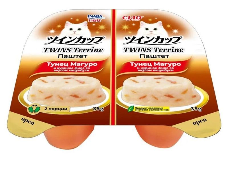 Суперпремиальный паштет для кошек CIAO TWINS Terrine (ЧАО ТВИНС ТЕРРИН) от японского производителя Inaba приготовлен на основе мяса глубоководного тунца Магуро и нежных кусочков филе фермерской курицы с добавлением кацуобуси. Корма и лакомства Inaba отличаются высоким качеством и неповторимым вкусом, ведь они изготавливаются на основе отборных традиционных японских ингредиентов! Во все продукты добавлен экстракт зеленого чая, который, благодаря содержанию катехина, нейтрализует неприятные запахи содержимого кишечника. Состав обогащён витамином Е - натуральным антиоксидантом, поддерживающим иммунную систему, не содержит искусственных добавок, красителей и консервантов.