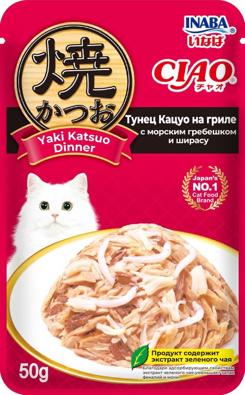 INABA Влажный корм д/кошек Yaki Katsuo Dinner Тунец Кацуо на гриле с морского гребешка и ширасу пауч 50г*16шт(800гр.)