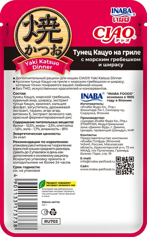 Супер-премиальный влажный корм для кошек CIAO Yaki Katsuo Dinner (ЧАО ЯКИ КАЦУО ДИННЕР) от японского производителя Inaba приготовлен на основе кусочков мяса тунца Кацуо, приготовленного на гриле, с добавлением морского гребешка и мальками ширасу. Внутри упаковки пауча ароматные нежные волокна в соусе, которые подойдут даже самым привередливым кошкам и кошкам с чувствительным пищеварением.
