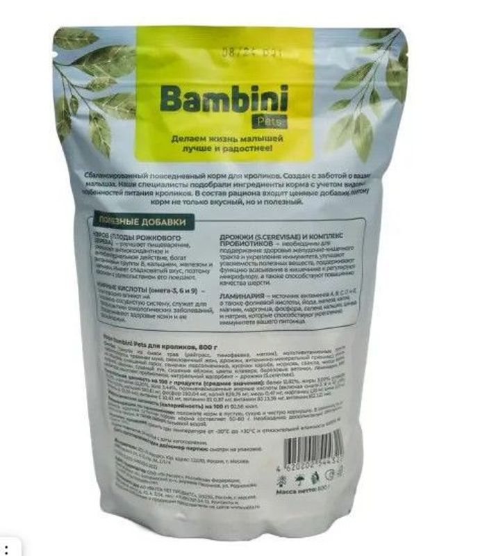 Ингредиенты: гранулы из смеси трав (райграсс, тимофеевка, мятлик), мультивитаминные гранулы (зернопродукты, травяная мука, свекловичный жом, дрожжи, витаминно-минеральный премикс), гранулы из люцерны, плющеный горох, семечки подсолнечника, кусочки кэроба, морковь, свекла, чипсы банана, паприка, цуккини, сушеный лук, сушеные яблоки, цветы клевера, березовые веточки, ламинария, юкка шидигера, комплекс пробиотиков, натуральный адсорбент - дрожжи (S.cerevisae). Питательная ценность на 100г: белки 12,74%, жиры 3,19%, углеводы 26,87%, клетчатка 10,68%, зола 3,44%, полиненасыщенные жирные кислоты (включая Омега 3-6-9) 1,99%, влага 4,50%, кальций 101,61 мг, фосфор 236,04 мг, калий 829,75 мг, медь 0,47 мг, марганец 1,39 мг, цинк 3,07 мг, Витамин А 33,56 мкг, Витамин С 10,61 мг, Витамин В1 0,87 мг, Витамин В3 13,36 мг, Витамин В12 1,21 мкг. Энергетическая ценность на 100г: 92,56 ккал.