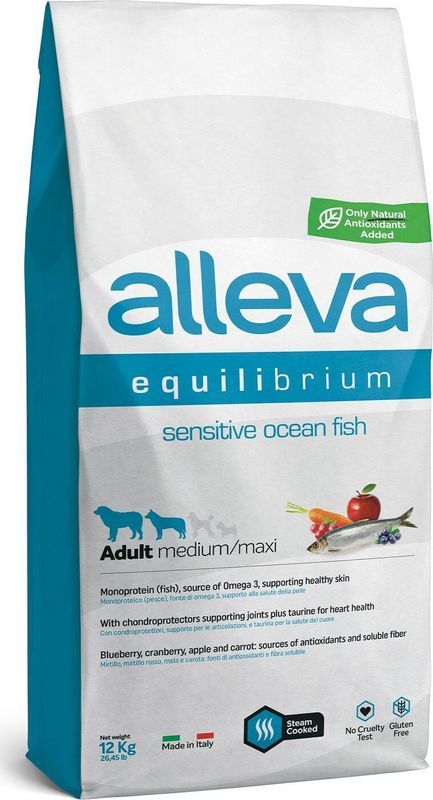 - Продукт приготовлен на пару для максимальной сохранности качества ингредиентов. В состав кормов Alleva Equilibrium добавлены фрукты и овощи, которые выполняют роль дополнительного источника растворимой клетчатки, витаминов и минералов, а также природных антиоксидантов, обеспечивающих свежесть корма на протяжении всего срока годности.