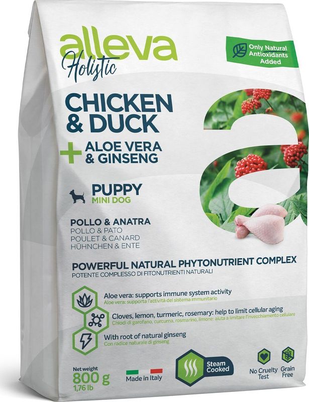 Полнорационный сухой корм Alleva Holistic для щенков мелких пород, беременных и кормящих собак с курицей, уткой, алоэ вера и женьшенем. Подходит для щенков и юниоров мелких пород до 12 месяцев, а также для беременных и кормящих собак. Сухой беззерновой корм класса Холистик на основе курицы и утки. Основной ингредиент - дегидрированная курица (45 %) и свежая курица без костей (20 %) - отличный легкоусвояемый белок, который идеально подходит для нежного пищеварения щенков в период роста. Является отличным источником для формирования и развития мышечной массы питомца. Дегидрированная утка (10 %) - дополнительный источник животного белка в корме, богатый полезными аминокислотами и придающий дополнительную вкусовую привлекательность корму. Источник углеводов - батат. Кроме того, батат - отличный источник клетчатки, а также природных антиоксидантов. Укрепляет иммунную систему щенков и собак. Натуральный консервант - куриный жир. Источник омега-6 кислот, а также линолевой кислоты. Гороховый крахмал и волокна гороха - источник растительного белка и клетчатки. Способствует правильному пищеварению. Рыбий жир - легкоусвояемый источник незаменимых жирных кислот. Куриная печень - дополнительный источник животного белка в корме. Придает корму дополнительную вкусовую привлекательность. Корень цикория - источник инулина и ФОС. Способствует пищеварению и является источником пребиотиков. Подорожник - природный источник клетчатки, помогает пищеварению и формированию правильного стула.