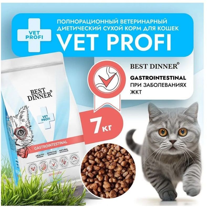 Вашему любимицу требуется особый уход и правильное питание? Тогда вам стоит обратить внимание на высококачественный полнорационный сухой корм Best Dinner Vet Profi Gastrointestinal Этот корм разработан специально для кошек, страдающих заболеваниями желудочно-кишечного тракта.Благодаря своему составу и уникальной формуле, этот сухой корм помогает предотвратить развитие заболеваний, таких как:- воспалительные заболевания кишечника- острая и хроническая энтеропатия- констипация- экзокриннная недостаточность поджелудочной железы- гастрит- колит. Высококачественный кошачий корм Gastrointestinal применяется при кишечных расстройствах, нарушениях пищеварения, в реабилитационный период и при истощении у кошек. Кроме того, он легко усваивается Желудочно-кишечным трактом и не вызывает аллергических реакций.Для тех, кто в поиске корма для кошек гипоаллергенного, это отличный выбор. Корм супер-премиум не содержит пшеницу и кукурузу, сои и пищевых вкусоароматических добавок. Только органика, благодаря которой корм для собак остается полезным и неизменно вкусным. Картофель повышает энергетическую ценность рациона, снижая объем суточной порции. Рыбий жир является источником Омега-3 жирных кислот, уменьшающих воспаление. Дрожжи отличный источник витаминов группы В, поддерживающих нормальный обмен веществ и укрепляющих иммунитет. Топинамбур источник инулина, пребиотик для питания полезной кишечной микрофлоры. Юкка Шидигера снижает запах из лотка и способствует выведению токсинов из организма.Корм кошачий Бест Диннер VET PROFI Gastro Intestinal обогащен всеми необходимыми витаминами и минералами, которые не только легко усваиваются и не вызывают проблем с пищеварением, но и укрепляют иммунитет, улучшают состояние шерсти и общую физическую форму кошки.Рекомендуемая продолжительность применения до 12 недель и в течении всей жизни в случае хронического заболевания ЖКТ. Рекомендуется проконсультироваться с ветеринарным врачом об употреблении или о продлении периода использования данного корма.Бест Диннер – это универсальная еда для кошек любых пород. Корм для кошек сухой Бест Диннер подойдет для пород, таких как: британская, сибирская, сиамская, шотландская, мейн-кун, персидская, сфинкс.Выбирайте лучший корм для котов – полнорационный диетический корм для кошек Best Dinner VET PROFI Gastro Intestinal. Обеспечьте своей кошке здоровое питание и поддержку здоровья почек, чтобы она могла наслаждаться жизнью на полную котовую!