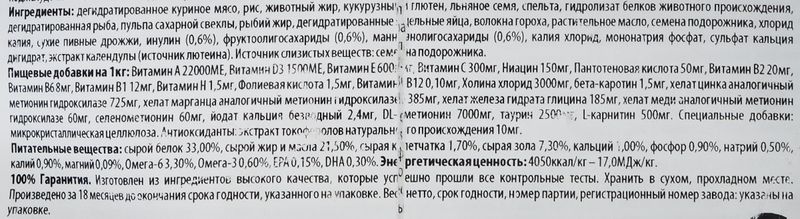Дегидратированное куриное мясо, рис, животный жир, кукурузный глютен, льняное семя, спельта, гидролизат белков животного происхождения, дегидратированная рыба, пульпа сахарной свеклы, рыбий жир, дегидратированные цельные яйца, волокна гороха, растительное масло, семена подорожника, хлорид калия, сухие пивные дрожжи, инулин (0,6%), фруктоолигосахариды (0,6%), маннанолигосахариды (0,6%), калия хлорид, мононатрия фосфат, сульфат кальция дигидрат, экстракт календулы (источник лютеина). Источник слизистых веществ: семена подорожника.