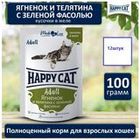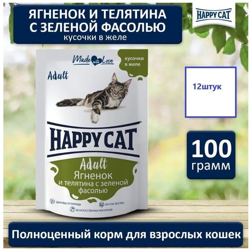 Корм влажный для кошек Хэппи Кэт (Happy Cat) кусочки ягненок, теленок, зеленая фасоль в желе, пауч 12шт*100гр (1200гр)