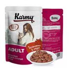 Karmy Adult - это порция аппетитных кусочков в ароматном желе, приготовленных с учетом индивидуальных потребностей взрослых кошек всех пород старше 1 года.