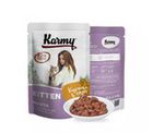 Karmy Kitten - это порция сочных кусочков в ароматном соусе, приготовленных с учетом индивидуальных потребностей котят до 1 года, а также беременных и кормящих кошек.