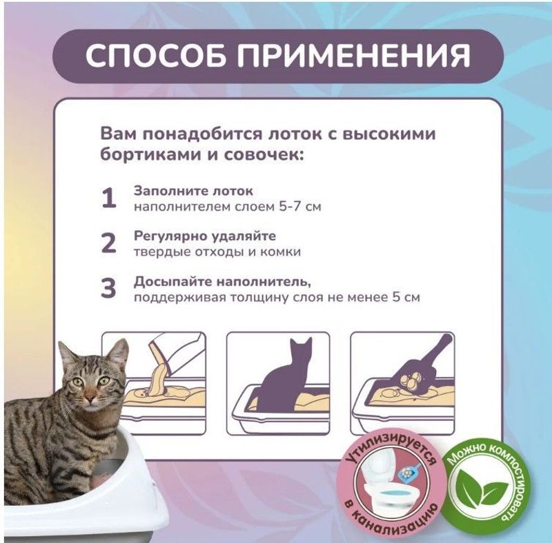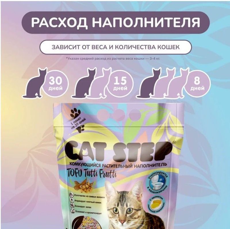 Растительные волокна, которые являются основой наполнителя CAT STEP Tofu Tutti Frutti, легко растворяются в воде, поэтому его можно смывать в канализацию без опасений. Растительные волокна – это натуральный и экологически чистый материал, который не подвергается химической обработке, что гарантирует его гипоаллергенность и безопасность для питомцев и их хозяев. Благодаря волокнистой структуре при попадании жидкости соевые гранулы образуют плотный комок, который легко удалить из лотка. Жидкость, попадая на гранулы, не растекается, не застаивается, и запах блокируется внутри наполнителя. Разноцветные гранулы нежных оттенков поднимут настроение хозяину и освежат помещение легким ароматом лимонной карамели. Заполните сухой и чистый лоток наполнителем CAT STEP Tofu Tutti Frutti слоем 5-7 см. Регулярно удаляйте комочки и экскременты, досыпая на их место свежий наполнитель. Использованный наполнитель можно смывать в унитаз. Объем: 6 л.