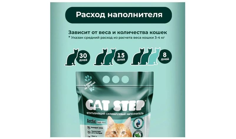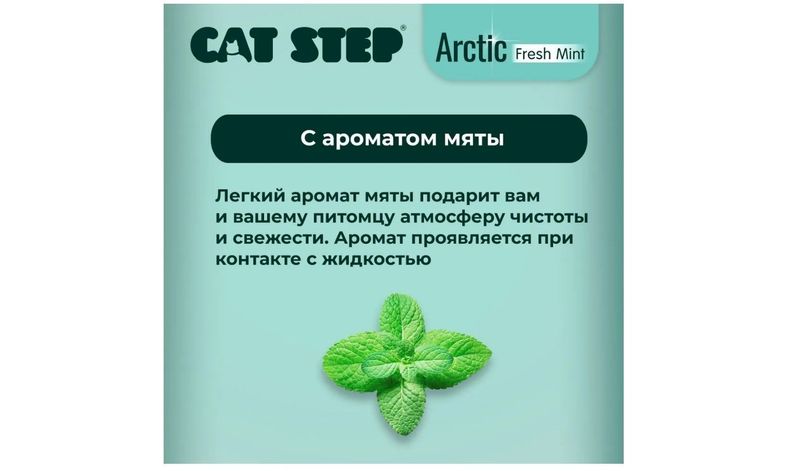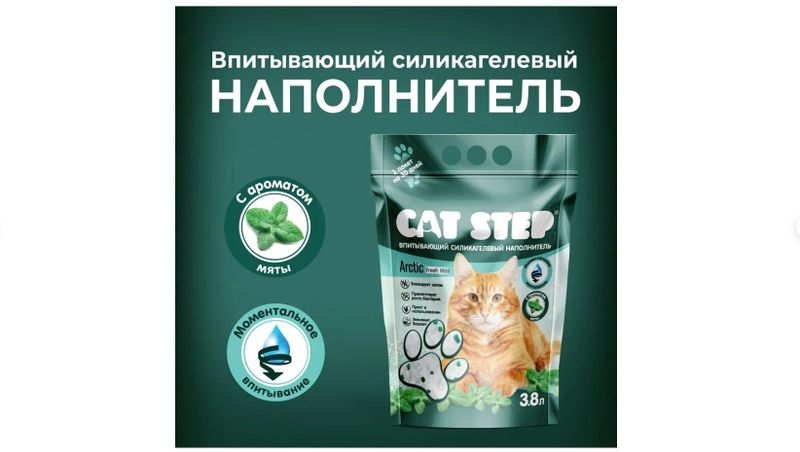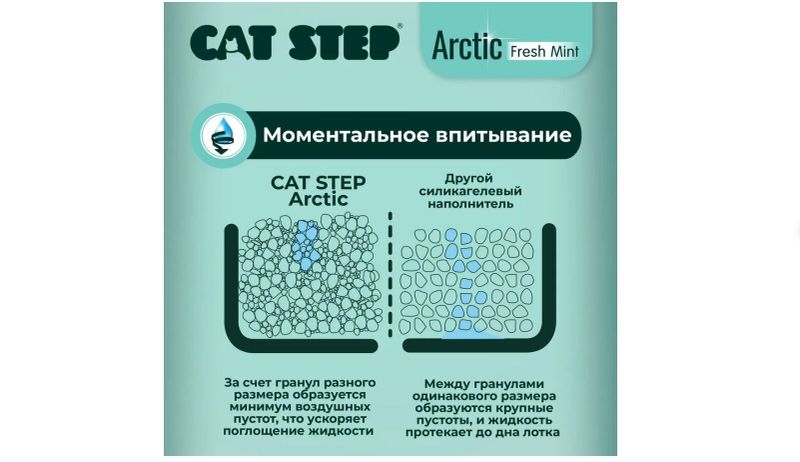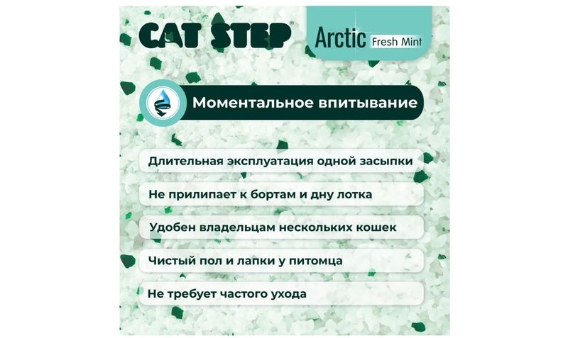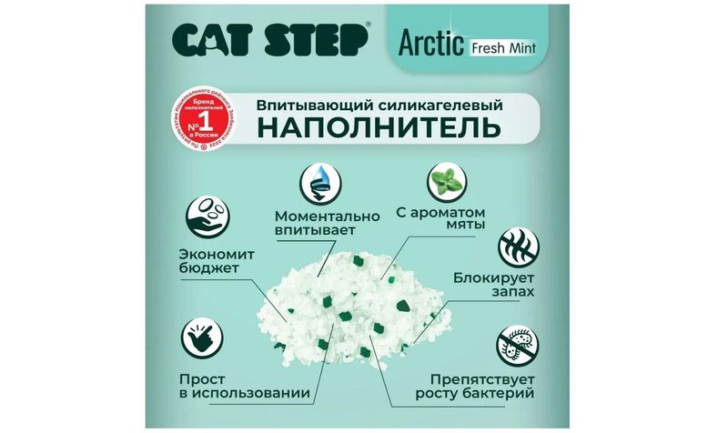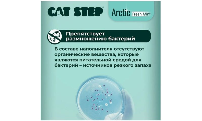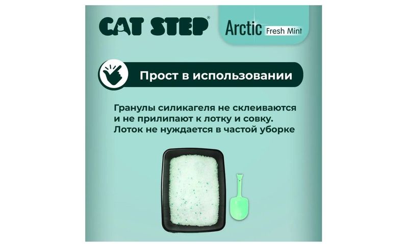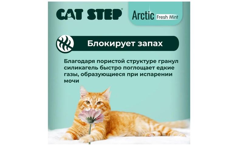 Cиликагелевый наполнитель для кошачьего туалета CAT STEP Arctic Мята моментально впитывает влагу и уничтожает запахи. Пористая структура кристаллов обеспечивает их высокую способность к поглощению жидкостей и запахов. Наполнитель препятствует размножению и развитию бактерий и грибков за счет своего неорганического происхождения. Наполнитель не требует постоянного контроля и ежедневной уборки кошачьего лотка. Содержимого пакета 3,8 л хватает в среднем на 1 месяц использования. Содержит красные гранулы c легким ароматом клубники, активирующимся при контакте с жидкостью. Заполните сухой и чистый лоток наполнителем CAT STEP Arctic Мята слоем 3-5 см. Регулярно удаляйте экскременты и перемешивайте наполнитель для равномерного распределения свежих кристаллов. Примерно через 4 недели удалите использованные гранулы и замените их новой порцией наполнителя. Не выбрасывайте использованный наполнитель
