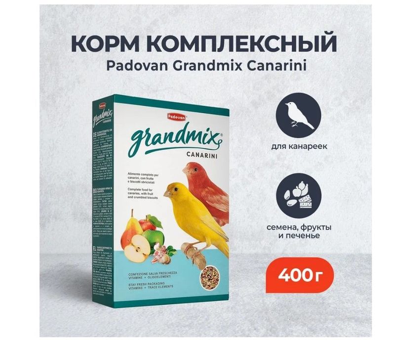 Канареечное семя 64.0%, семена рапс/сурепица 11.0%, овёс лущёный 9,9%, льняное семя 4.8%, масличный нуг(гвизоция абиссинская) 2,9%, яблоко, груша, печенье: пшеничная мука, дрожжи, краситель, минералы, натуральные вкусовые добавки, витамины.