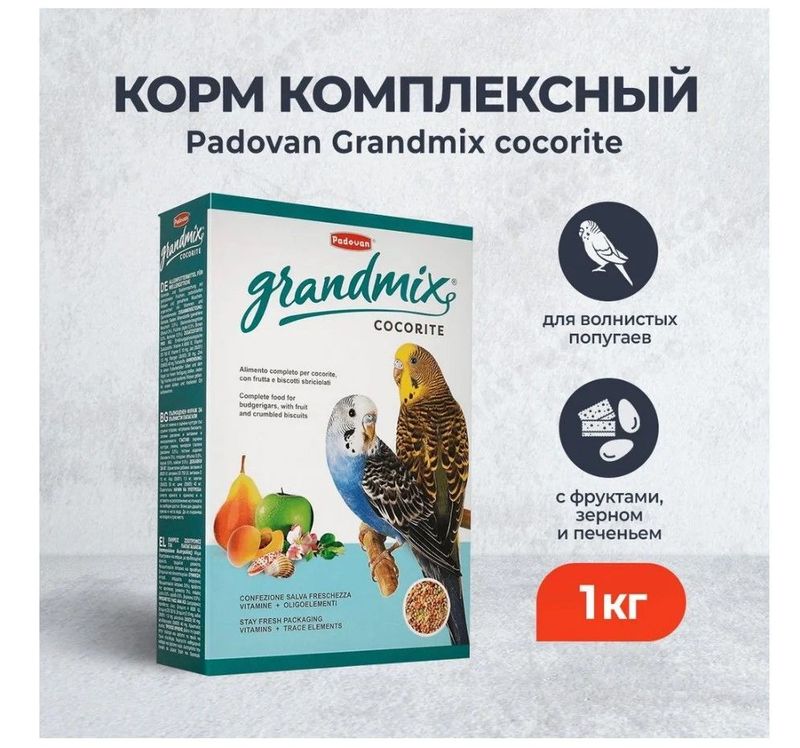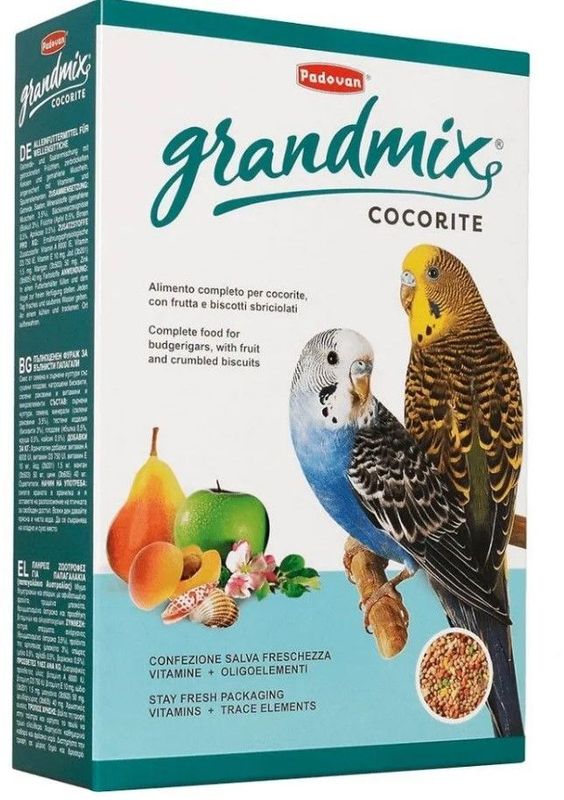 Желтое, белое, красное просо 68.3%, канареечные зёрна 11.9%, овёс лущёный 12.9%, яблоко, груша, печенье: пшеничная мука, дрожжи, краситель, минералы, натуральные вкусовые добавки, витамины.