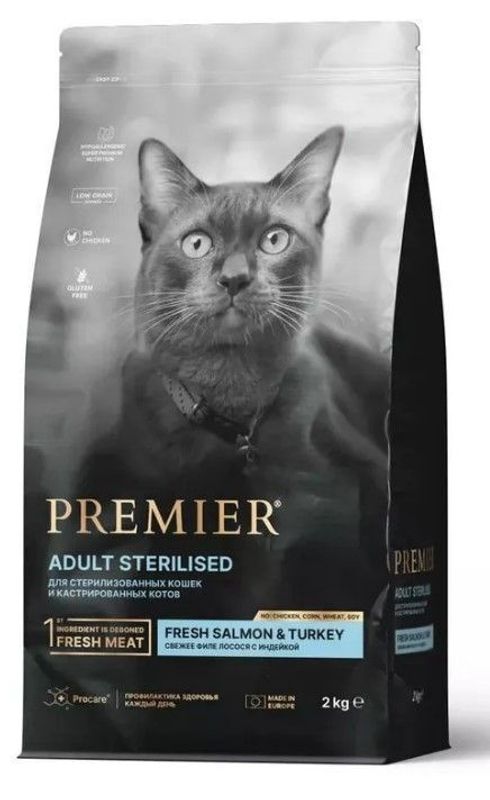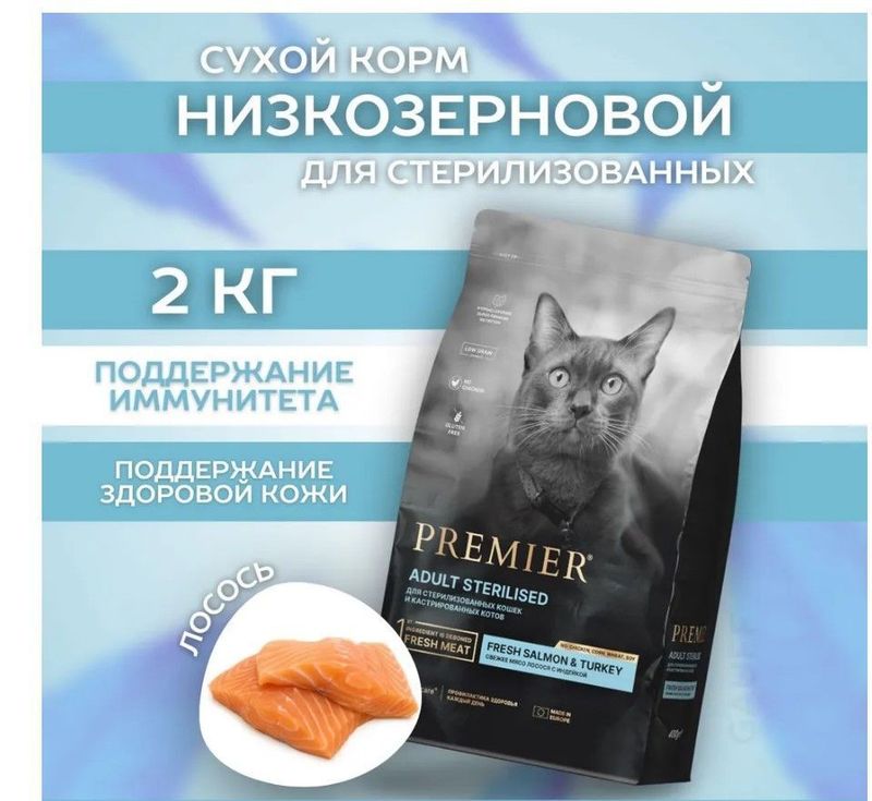 Для взрослых стерилизованных кошек и кастрированных котов от 1 года с чувствительной кожей и шерстью или склонных к аллергии или пожилых кошек. Свежее гипоаллергенное и питательное филе лосося и постной индейки благотворно влияют на пищеварительную систему кошки. Благодаря гипоаллергенным ингредиентам, одному виду зерновых, отсутствию глютена, корм имеет отличную усвояемость, высокую пищевую ценность и помогает оставаться вашему питомцу здоровым и жизнерадостным на протяжении долгих лет жизни. Поддерживает здоровье чувствительной кожи и шерсти кошки за счет счёт правильно подобранных ингредиентов, а также сбалансированному содержанию омега-3 и 6 жирных кислот. СВЕЖЕЕ МЯСО БЕЗ КОСТЕЙ Мы используем свежее мясо высшего сорта, изначально пригодное для употребления человеком. Это гарантирует, что ваш питомец получает высокопитательный, чрезвычайно вкусный, легко усвояемый высококачественный источник белка. НИЗКОЗЕРНОВОЙ СОСТАВ Благодаря низкозерновому и безглютеновому составу наши корма легко усваиваются и отлично подходят для животных с чувствительным пищеварением или пищевой аллергией. ФРУКТЫ, ОВОЩИ И ЯГОДЫ Великолепное сочетание натуральных фруктов, овощей и ягод обеспечивает организм дополнительными полезными питательными веществами, которые жизненно необходимы для поддержания здоровья питомца. ГЛЮКОЗАМИН, ХОНДРОИТИН Хондропротекторы стимулируют процессы регенерации и замедляют дегенерацию (разрушение) хрящевой ткани. Содержащиеся в составе нашего корма хондроитин сульфат и глюкозамин принимают участие в образовании хрящей, биосинтезе синовиальной жидкости, оказывают противовоспалительное действие и замедляют дальнейший процесс разрушения соединительных тканей. ВИТАМИНЫ, АНТИОКСИДАНТЫ Витамины Е, С и Селен содержащиеся в составе корма выступают в роли мощной антиоксидантной системы, что способствует сохранению крепкого здоровья вашего питомца и снижает риски преждевременных возрастных изменений. НАТУРАЛЬНЫЕ ПРЕБИОТИКИ Формула корма идеально сбалансирована и включает в себя натуральные пребиотики, являющиеся неотъемлемым звеном в создании правильной кишечной микрофлоры питомца. ПРОФИЛАКТИКА ЗДОРОВЬЯ КАЖДЫЙ ДЕНЬ Богатые питательными веществами ингредиенты, помогают предотвратить аллергические реакции и пищевую непереносимость, обеспечивая иммунное и пищеварительное здоровье питомца. МЫ НЕ ИСПОЛЬЗУЕМ: Курицу, субпродукты, пшеницу, кукурузу, сою, глютен, ГМО, красители, ароматизаторы, консерванты