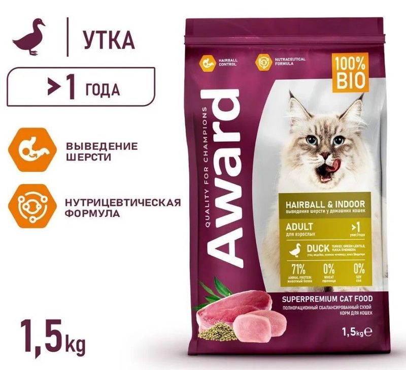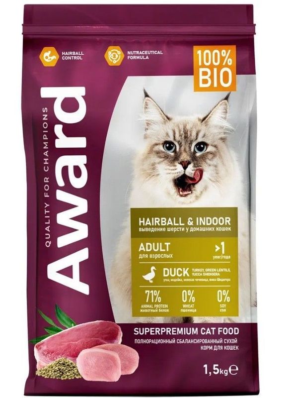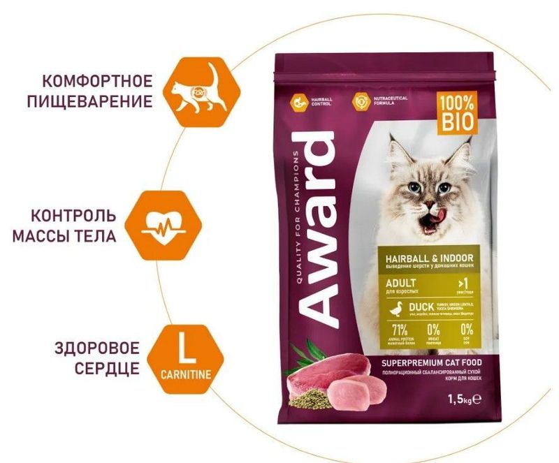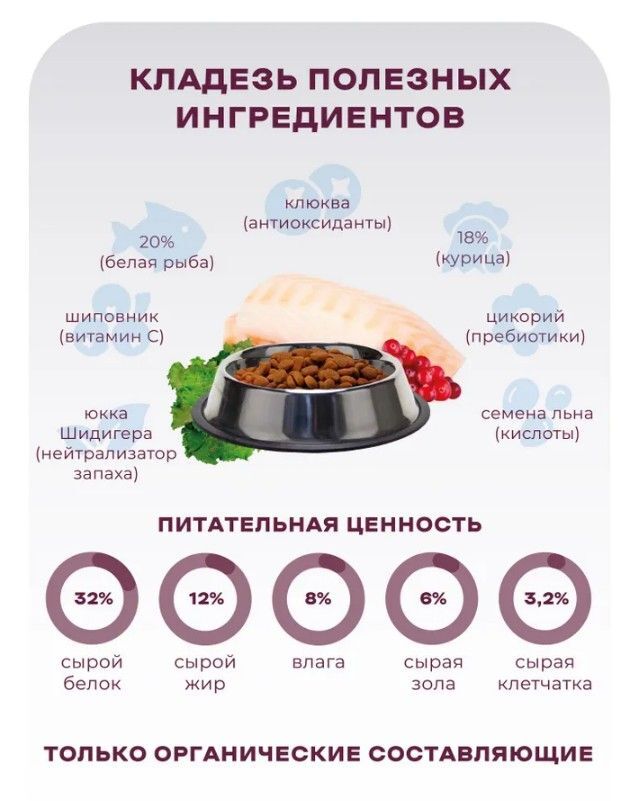 Дегидрированное мясо индейки 18%, дегидрированное мясо курицы 13%, рис, ячмень, жир животный (куриный), чечевица зеленая, рисовый протеин, гидролизованное мясо утки 4%, гидролизованные мясные белки, витаминно-минеральный комплекс (А, D, E, К3, В1, В2, В4, В6, В12, ниацин, пантотеновая кислота, биотин, фолиевая кислота), сухие пивные дрожжи, сушеная мякоть свеклы, семена льна, рыбий жир (лососевый), юкка Шидигера, шиповник, розмарин, цикорий, пробиотики (Bacillus subtilis, Bacillus licheniformis).