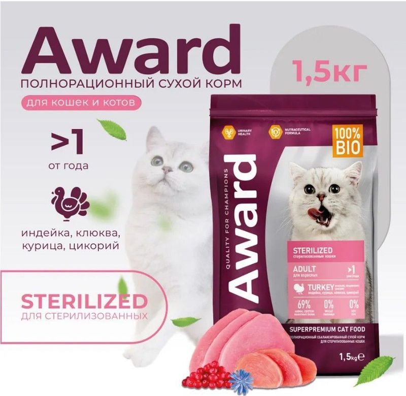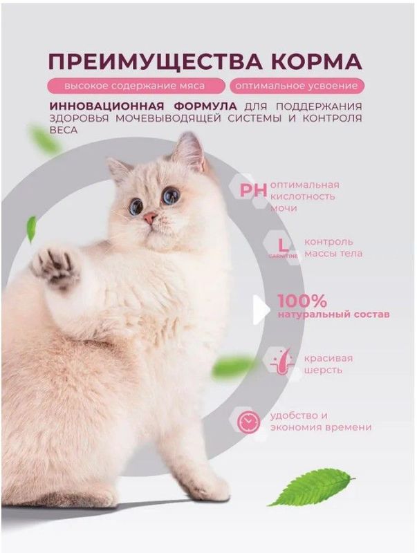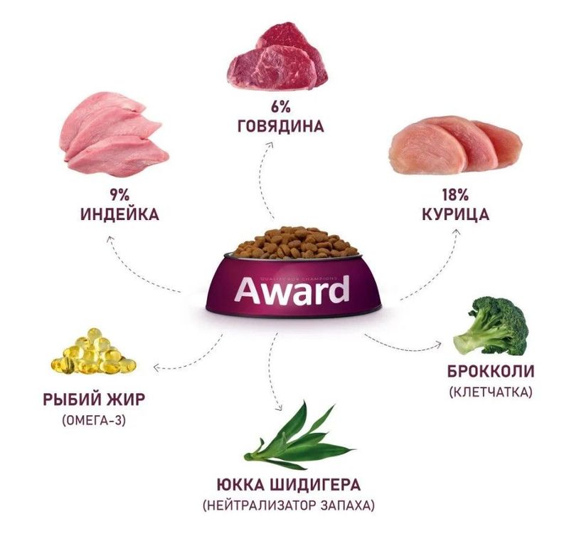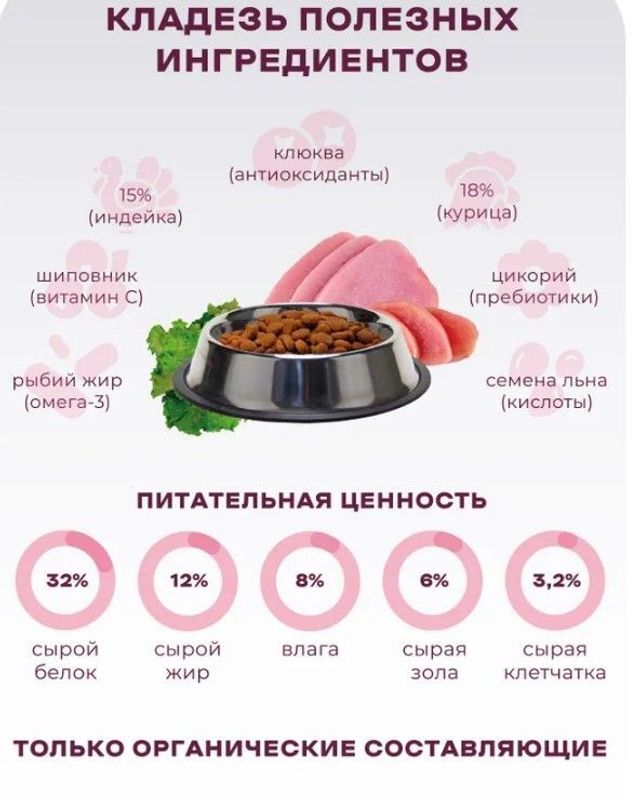 Добавки на 1кг: таурин 0,22%, L-карнитин 150 мг, Омега-3 - 0,5%, Омега-6 - 2%.