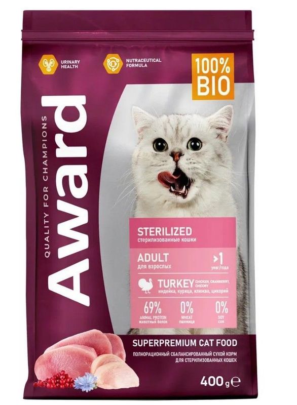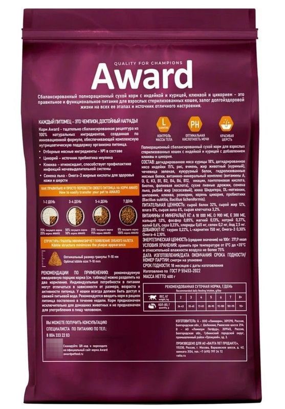 Добавки на 1кг: таурин 0,22%, L-карнитин 150 мг, Омега-3 - 0,5%, Омега-6 - 2%.