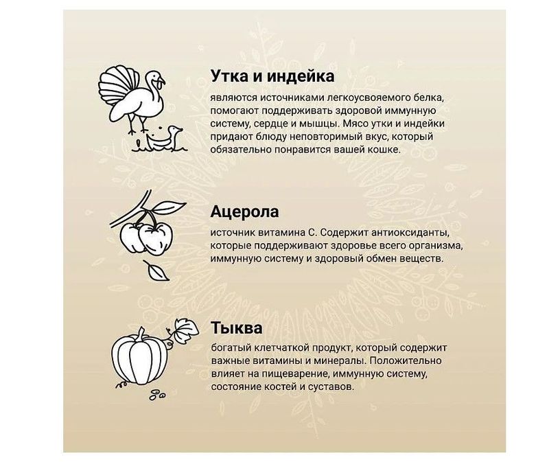 0% химической обработки сырья.Основные источники белка в корме — свежее мясо утки и индейки. Комбинация этих белков легко переваривается, помогает поддерживать оптимальный вес питомца, стабилизирует обмен веществ. Утка и индейка — отличные источники незаменимых аминокислот, витаминов и минералов. Исключен распространенный аллерген — курица. Источники углеводов — предварительно обработанные гороховый крахмал и экстракт семян киноа. Эти компоненты имеют низкий гликемический индекс, а значит — питомец дольше чувствует себя сытым и не переедает. Источники клетчатки — свекольная пульпа, волокна гороха и люцерновая мука. Свекольная пульпа способствует здоровью слизистой кишечника, гороховая клетчатка стимулирует перистальтику, а люцерновая мука способствует размножению полезной микрофлоры кишечника. Суперфуды в корме — спаржа, черника, клюква, ацерола и многие другие. Суперфуды являются источниками витаминов, биологически активных компонентов и обладают антиоксидантными свойствами. Попробуйте Craftia, ощутите уверенность в качестве корма своего питомца — и наслаждайтесь жизнью в гармонии с природой!
